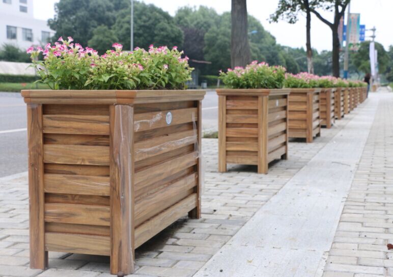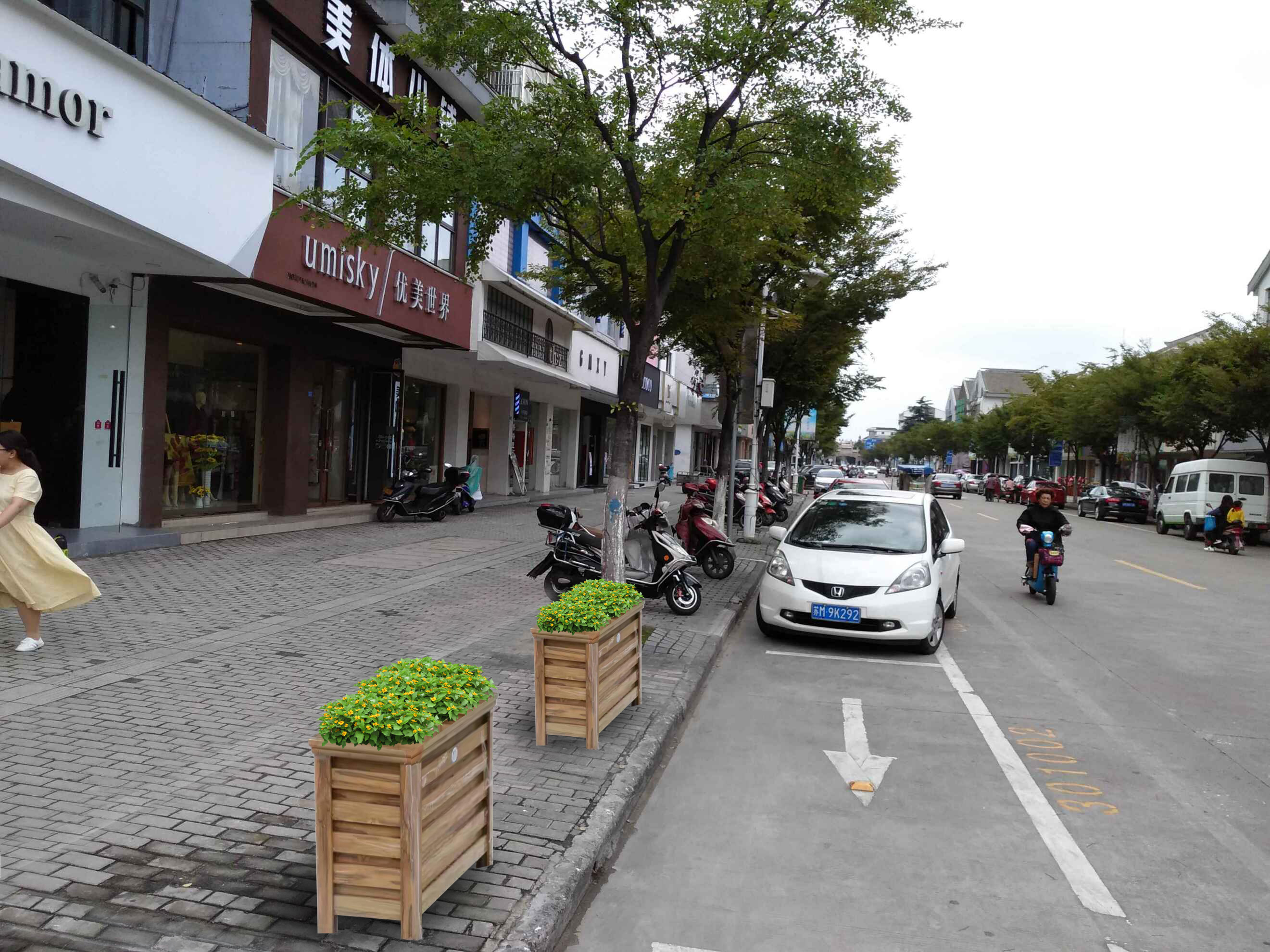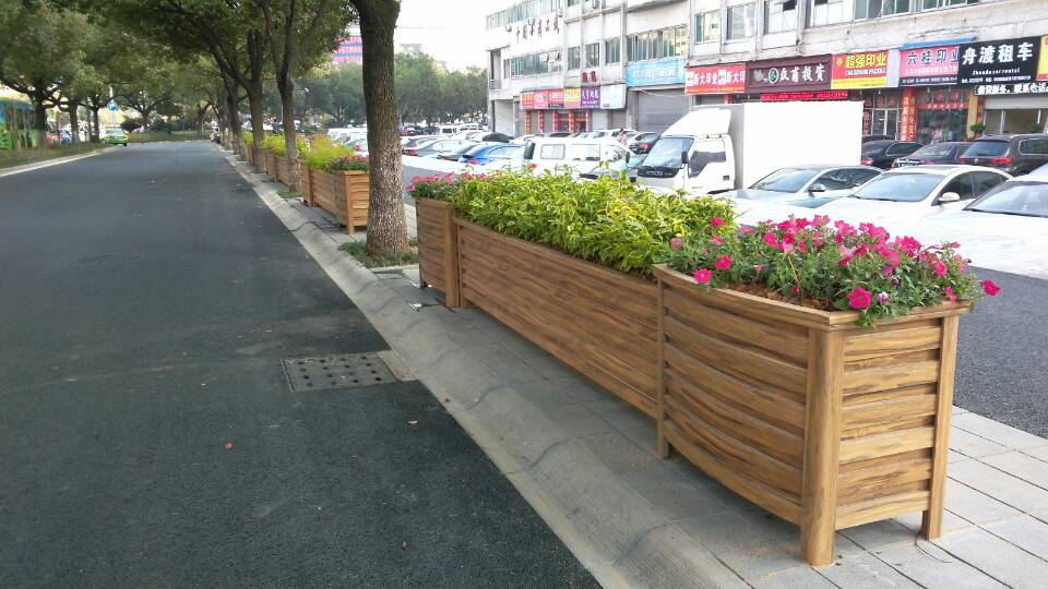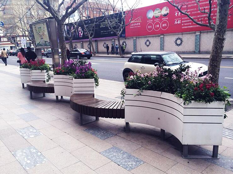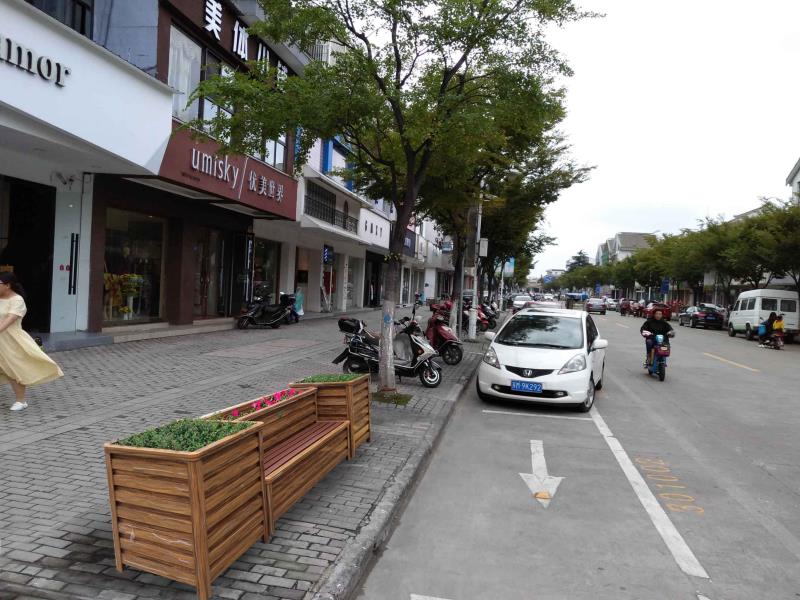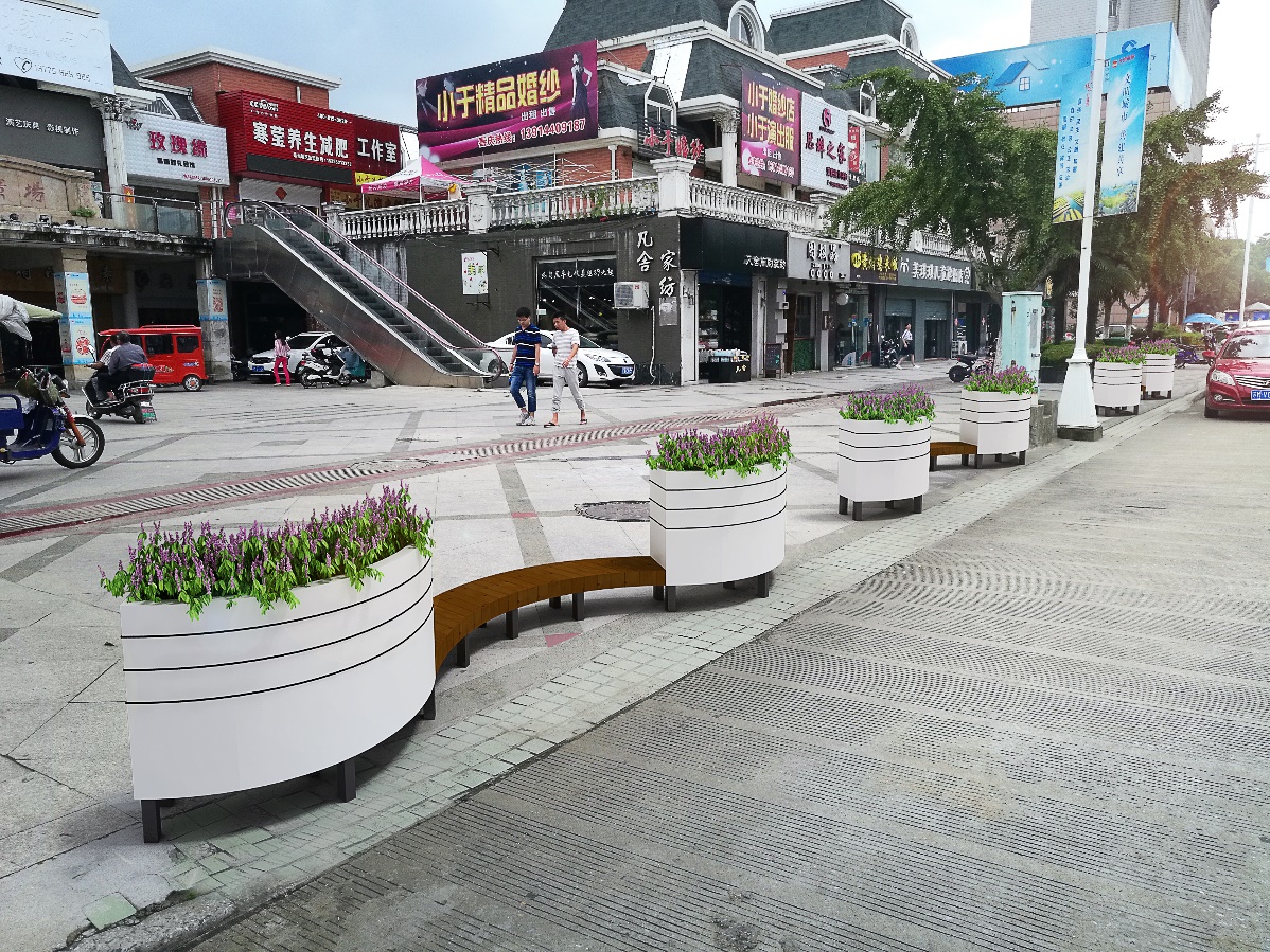 五一路人行道阻停设施设计方案: 五一路既是市民购物休闲的主要道路,又涵盖了学政试院、中山塔、李氏住宅等历史文化场所,沿线南侧为欧式商业建筑为主,北侧部分古典建筑。阻停设施设计以绿植花箱为主,石材为辅,色彩选择与周边建筑协调一致的木纹颜色。
