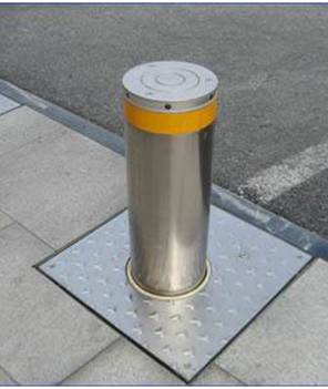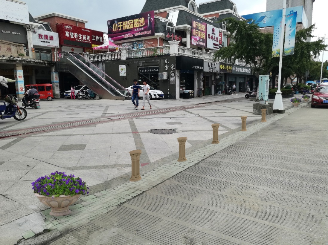 税务桥东街阻停设施现场效果图三 其他设计: 如人行道缘石坡道、消防通道、小区出入口等处,考虑安全与方便,采用造型简洁实用的不锈钢阻停设施(式样如下)。  |